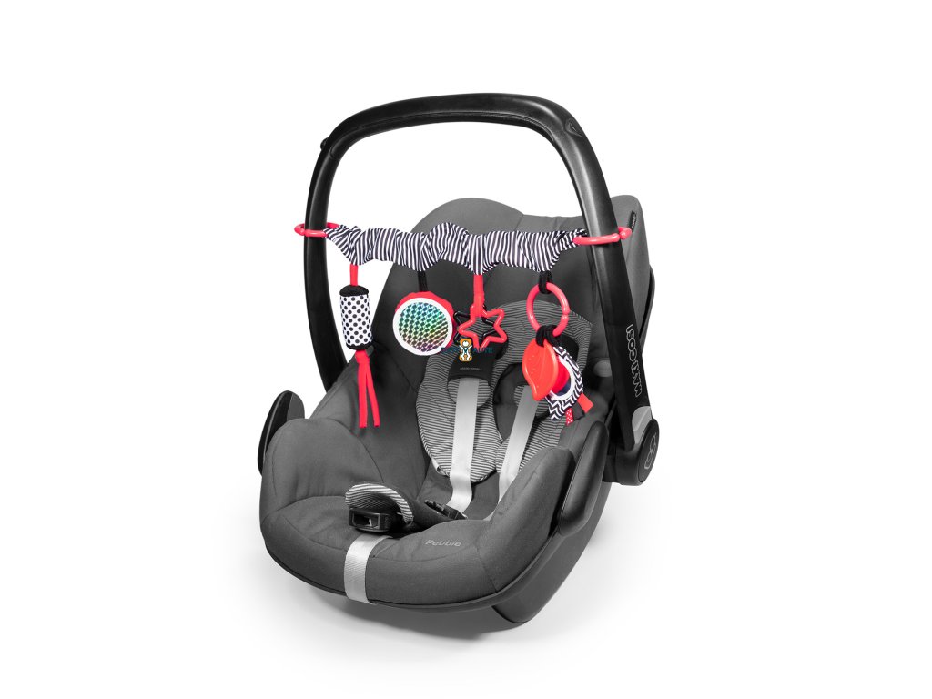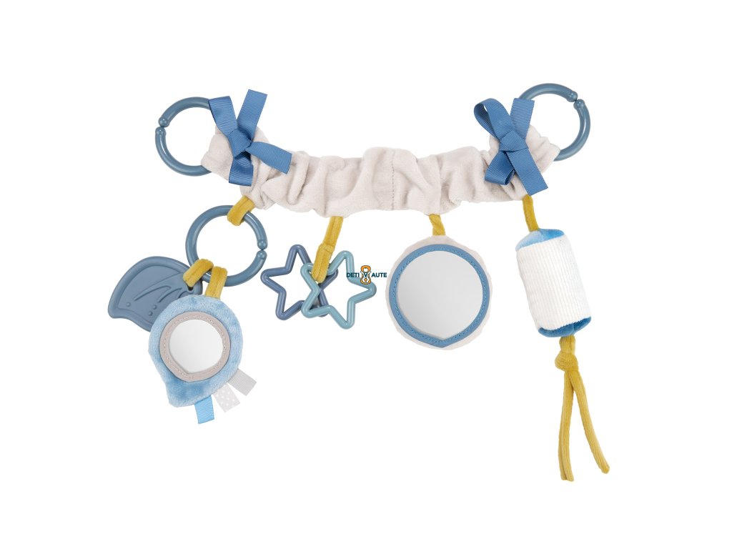 Obsahuje zvonček, hrkálku, šuštivé prvky, bezpečné zrkadielko a pružné hryzačky. Hračka je určená pre deti hneď od narodenia.